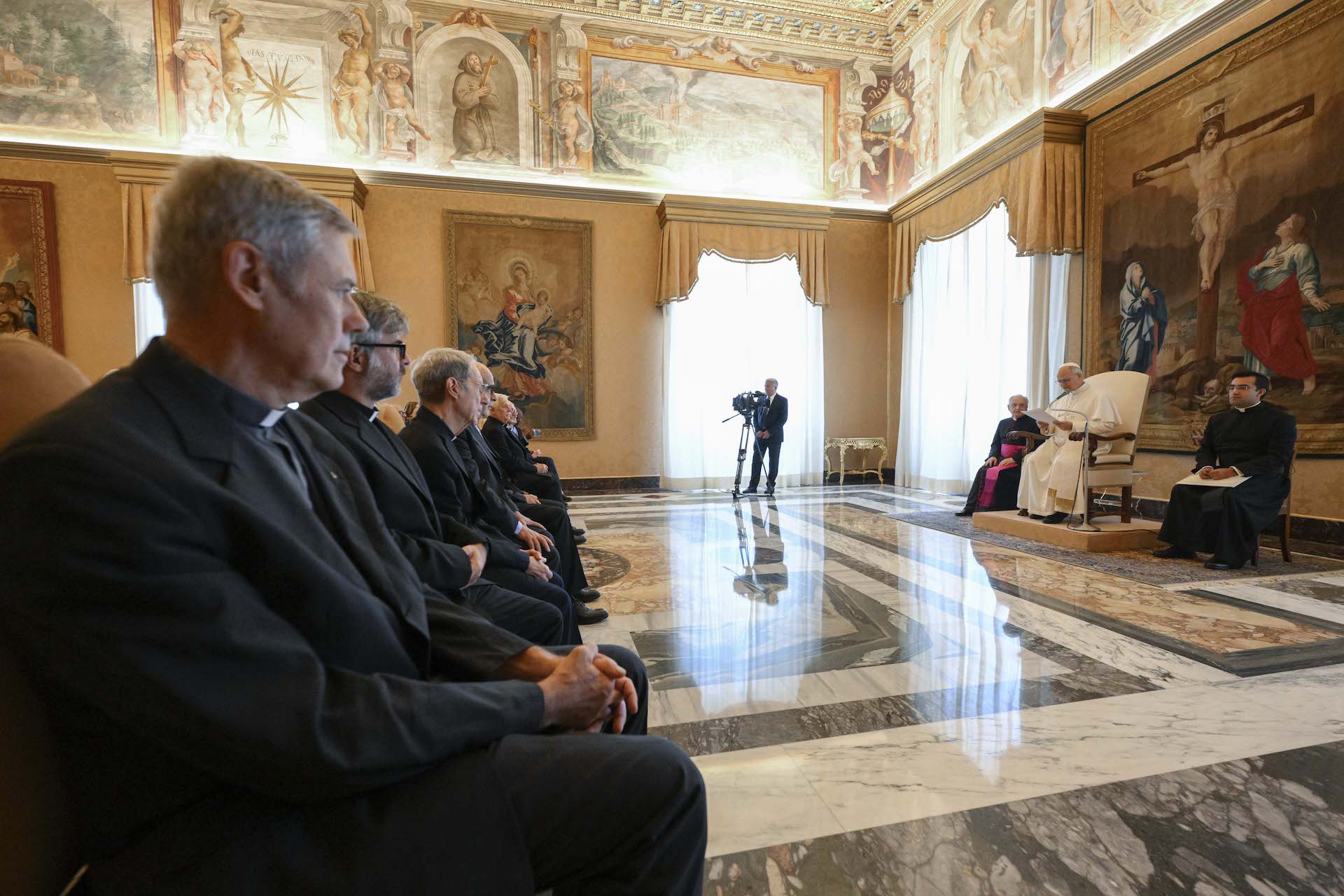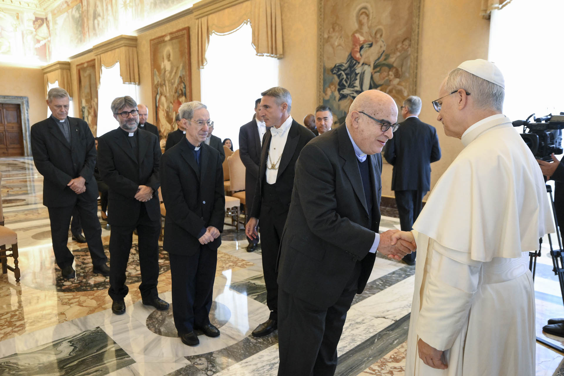 El jueves 25 de septiembre de 2025, el Papa León XIV recibió en audiencia, en la biblioteca privada del Palacio Apostólico, al p. Arturo Sosa S.I., Prepósito General de la Compañía de Jesús, y al p. Nuno da Silva Gonçalves S.I., director de «La Civiltà Cattolica». Tras este coloquio, en el Aula del Consistorio, el Pontífice se encontró con el Colegio de escritores junto a los demás padres de la comunidad de jesuitas, la comunidad de religiosas y los colaboradores de la revista y de la comunidad. Con ocasión de este encuentro, el Colegio de escritores quiso ofrecer al Santo Padre una recopilación de escritos sobre san Agustín aparecidos en la revista a lo largo de los últimos setenta años.
