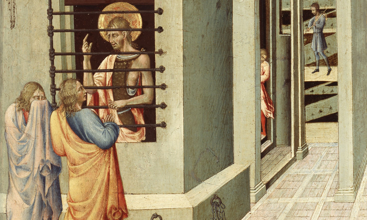 San Juan Bautista en la cárcel visitado por dos discípulos, Giovanni di Paolo (1455-1460)